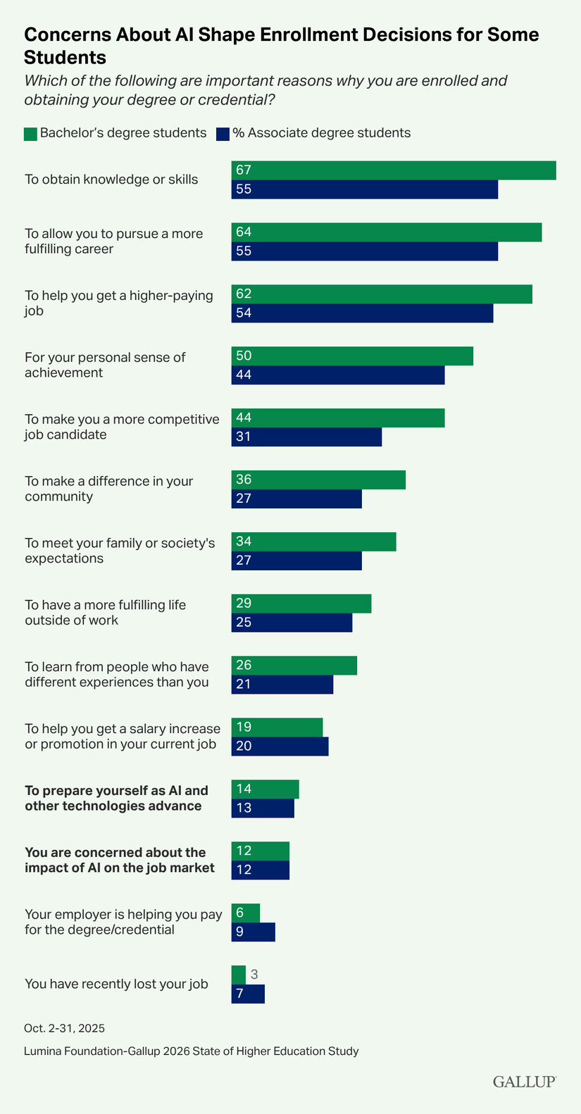 While AI is not yet the primary reason for enrollment shifts, its influence is clear. A study done by the Lumina Foundation finds that 12% of students pursuing Bachelors and Associates degrees are citing concerns about AI’s impact on the job market. Indicating that AI has already become part of how many students evaluate the role of postsecondary education in a changing labor market.